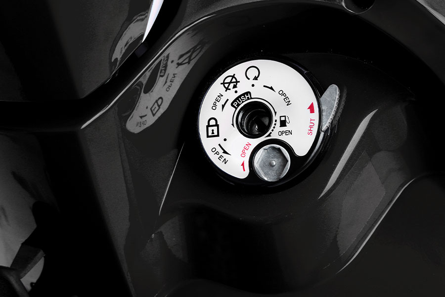 Η κεντρική κλειδαριά του MIO 50 συγκεντρώνει σε ένα σημείο όλες τις βασικές λειτουργίες: εκκίνηση, κλείδωμα τιμονιού, άνοιγμα σέλας και πρόσβαση στο ρεζερβουάρ — όλα ελέγχονται εύκολα με μία κίνηση.