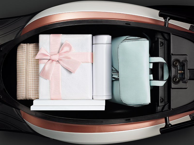 Το επίπεδο πάτωμα προσφέρει άνετη πρόσβαση στο scooter, με τον γάντζο στο εσωτερικό της ποδιάς να διευκολύνει τη μεταφορά τσάντας ή μικρού σακιδίου.