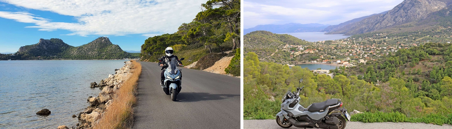 Συνιστώντας έναν εκρηκτικό συνδυασμό από ψιλή άμμο και βράχια, πεύκα, τιρκουάζ νερά, βοτσαλωτές παραλίες και κρυφές απάνεμες γωνιές αφημένες στην αγκαλιά της θάλασσας, οι φυσικές καλλονές των παραθαλάσσιων τοπίων του Κορινθιακού κόλπου αποπλάνησαν –όπως ήταν αναμενόμενο– σαν μαγευτικές σειρήνες τις αισθήσεις μου. Με το adventure toy SYM ADX 125 να μεταμορφώνεται (όπου χρειαζόταν) σ’ ένα μικρό off-road animal και την αύρα του Κορινθιακού κόλπου να χαϊδεύει διαρκώς το πρόσωπό μου, βίωσα ένα αναζωογονητικό ταξίδι γαλαζοπράσινης ομορφιάς και “έντυσα” με εικόνες ζωηρές, πραγματικές, έναν προορισμό που τον είχα σχηματίσει μόνο στη φαντασία μου.