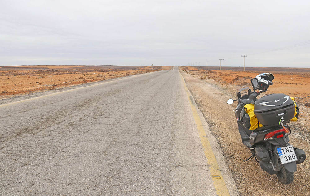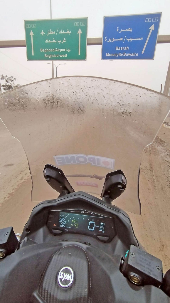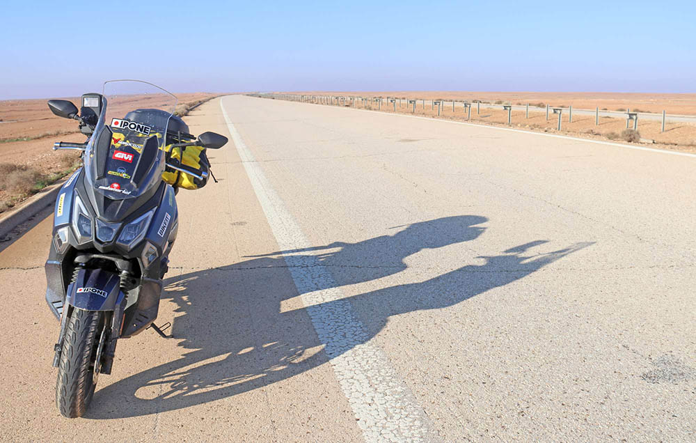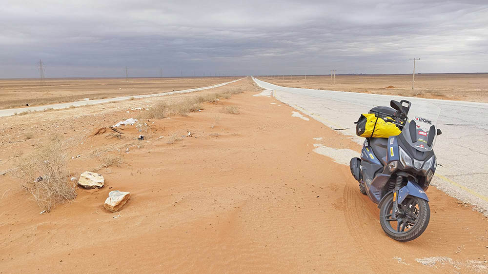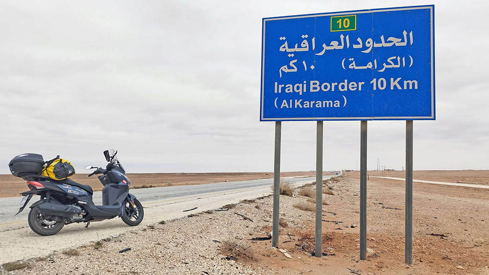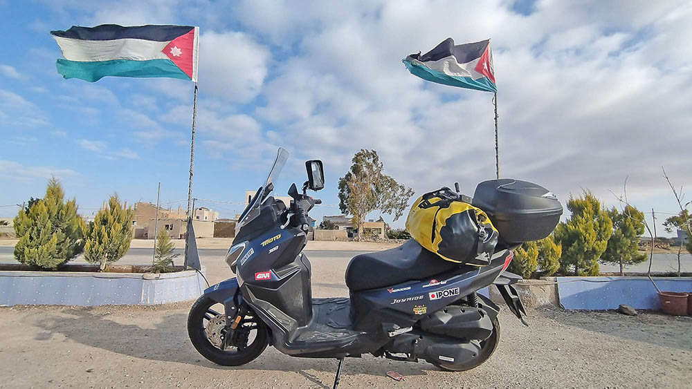 Στην Ιορδανία, οι κυριότερες στάσεις του Μητσάκη έγιναν στην πόλη Irbid, στον αρχαιολογικό χώρο της Jerash (Αντιόχεια επί Χρυσορρόη) και στην πρωτεύουσα Αμμάν. Με προορισμό τα σύνορα του Ιράκ, το μαύρο SYM JOYRIDE 300 βρέθηκε κατόπιν να διασχίζει την απέραντη ιορδανική έρημο. Μοναχικά χιλιόμετρα, χαμηλές θερμοκρασίες (3–4 ˚C), ελάχιστα σημεία ανεφοδιασμού και μια “ταλαιπωρημένη” άσφαλτος, ήταν τα κύρια χαρακτηριστικά της διαδρομής Αμμάν–Βαγδάτη (870 χιλιόμετρα). Χάρη στη χαμηλή κατανάλωσή του, το SYM JOYRIDE 300 πρόσφερε στον αναβάτη του μια αρκετά ικανοποιητική αυτονομία στο μοναχικό ταξίδι της ερήμου.