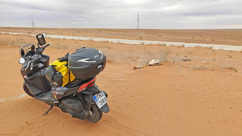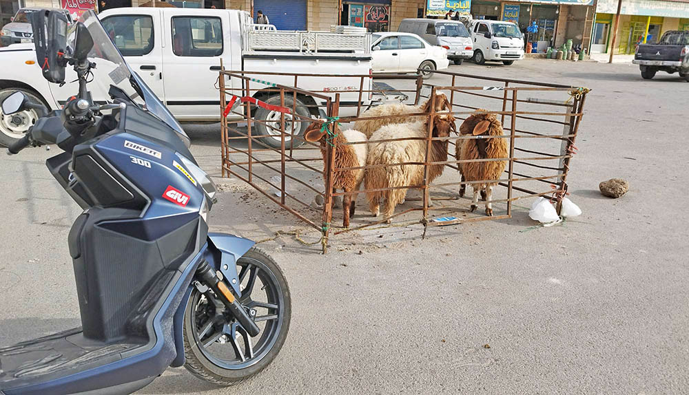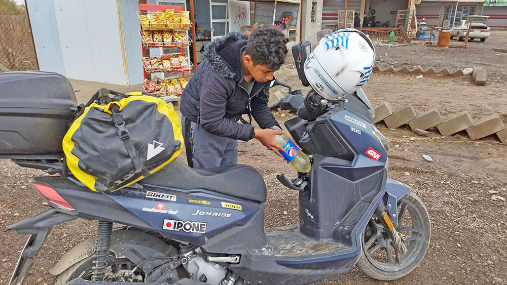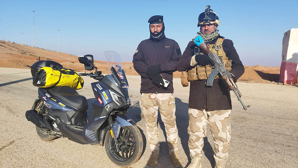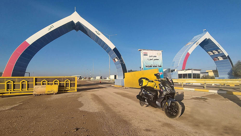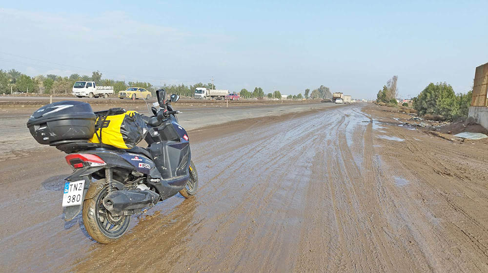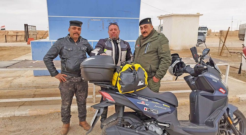 Στην Ιορδανία, οι κυριότερες στάσεις του Μητσάκη έγιναν στην πόλη Irbid, στον αρχαιολογικό χώρο της Jerash (Αντιόχεια επί Χρυσορρόη) και στην πρωτεύουσα Αμμάν. Με προορισμό τα σύνορα του Ιράκ, το μαύρο SYM JOYRIDE 300 βρέθηκε κατόπιν να διασχίζει την απέραντη ιορδανική έρημο. Μοναχικά χιλιόμετρα, χαμηλές θερμοκρασίες (3–4 ˚C), ελάχιστα σημεία ανεφοδιασμού και μια “ταλαιπωρημένη” άσφαλτος, ήταν τα κύρια χαρακτηριστικά της διαδρομής Αμμάν–Βαγδάτη (870 χιλιόμετρα). Χάρη στη χαμηλή κατανάλωσή του, το SYM JOYRIDE 300 πρόσφερε στον αναβάτη του μια αρκετά ικανοποιητική αυτονομία στο μοναχικό ταξίδι της ερήμου.